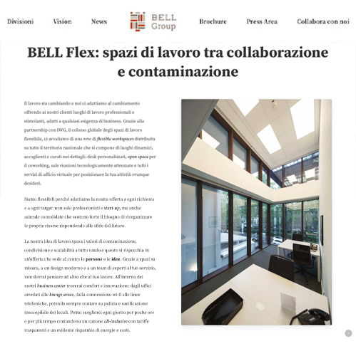 Attività di consulenza per la società BELL Flex dedicata allo sviluppo in franchising di flexible office sul territorio italiano. Obiettivo: comunicazione e marketing, in coordinamento con la multinazionale IWG, di tutte le nuove aperture italiane.